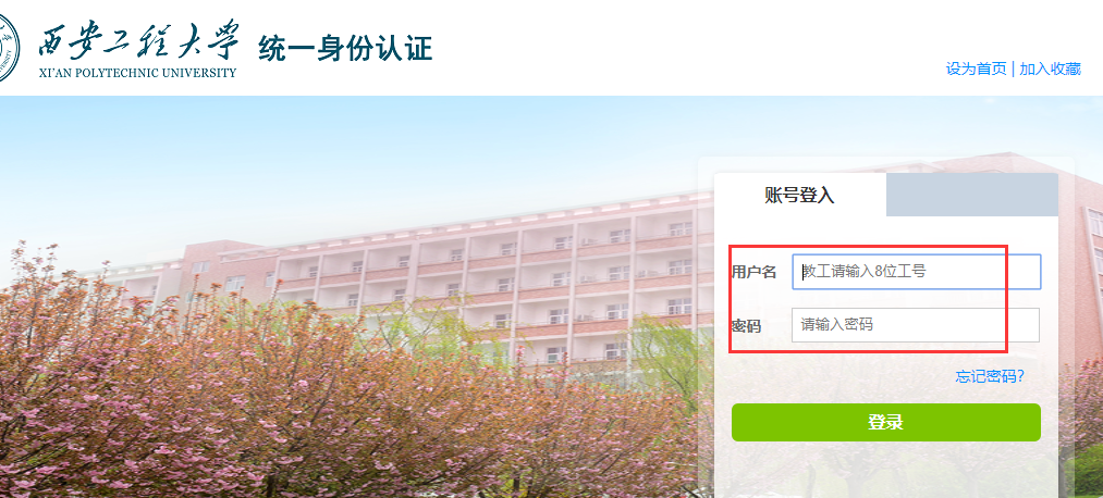 三、跳转至“新葡的京集团350vip8888官网”身份验证界面后,输入账号/密码(账号为:一卡通号,默认密码:身份证号后6位,若忘记密码,请发邮件给韩老师:hanwei@xpu.edu.cn)。