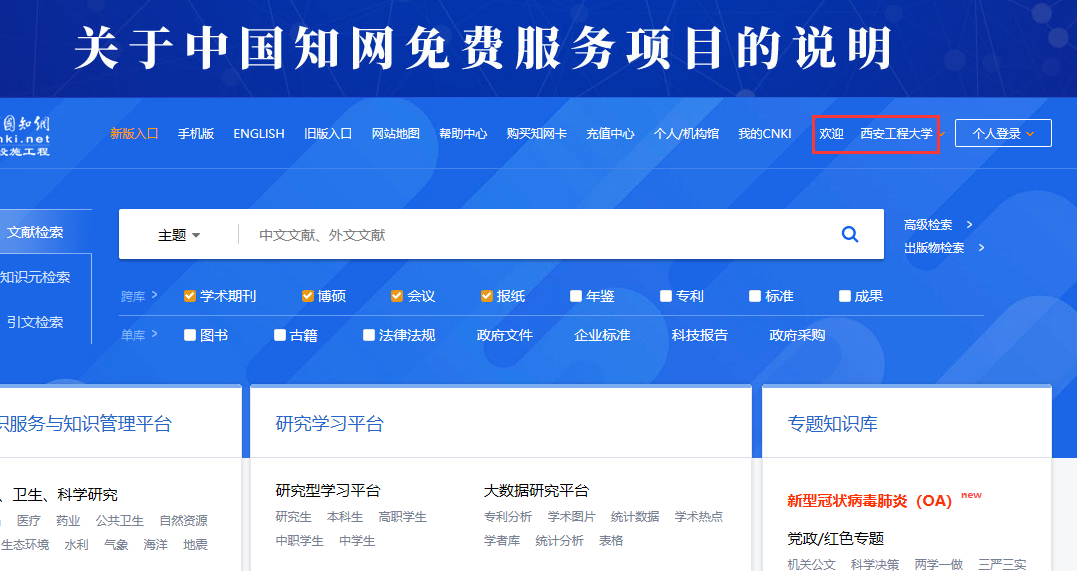 五、自动跳转知网主界面,并有“欢迎新葡的京集团350vip8888官网”提示,就可以访问图书馆订购的资源了。
