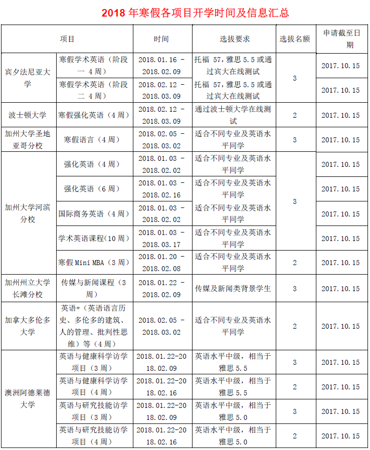 根据我校与全美国际教育协会签署的合作教育协议,双方商定拟于今年开始选派我校优秀本科生、研究生赴美国哥伦比亚大学、宾夕法尼亚大学、加州大学河滨分校、加州大学圣地亚哥分校、威斯康星大学麦迪逊分校、波士顿大学及多伦多大学进行校际交流学习。为确保选派工作的有序开展,现将有关事项通知如下:
