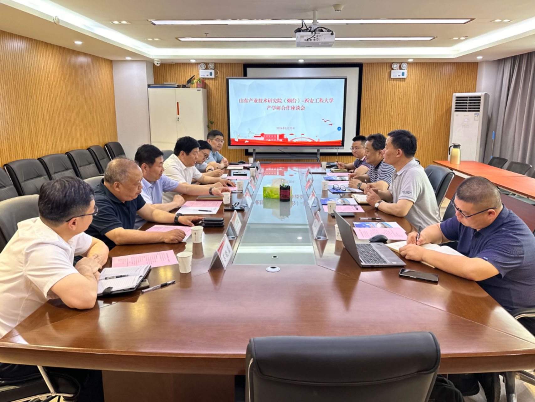 5月20日下午,山东产业技术研究院(烟台)党委书记崔振忠,总工程师、光电平台公司董事长潘峰一行4人来访我校,并在金花校区科二楼501会议室举行产学研合作座谈会。校长王海燕、校党委副书记殷永建出席座谈会,国内合作与校友工作处、大学科技园、纺织科学与工程学院、材料工程学院等单位负责人参加会议,会议由大学科技园主任王志刚主持。