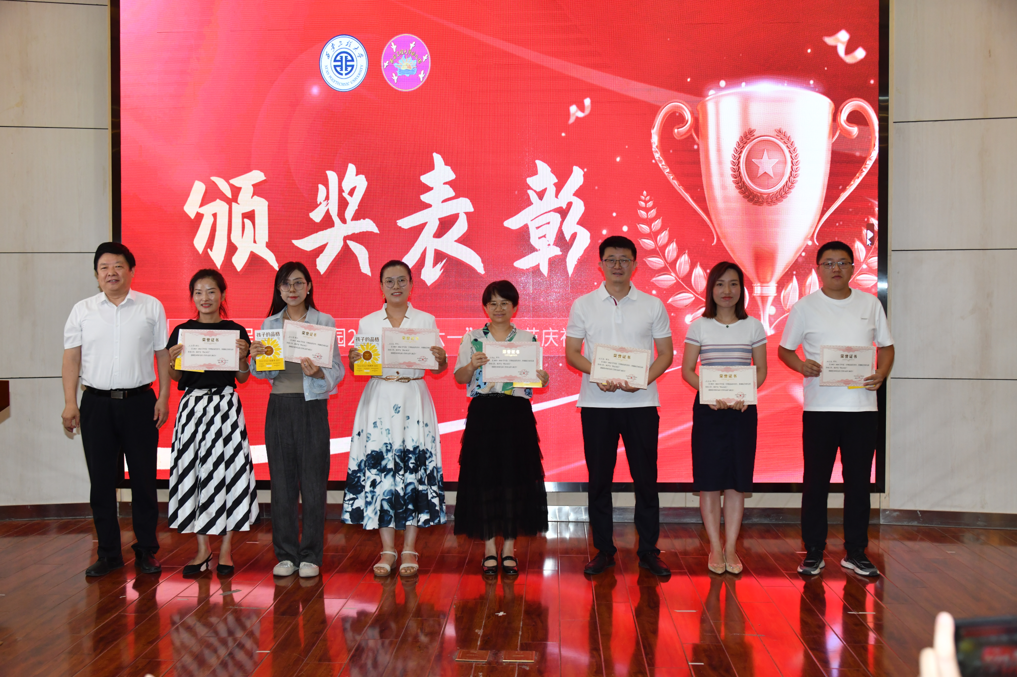 各职能部门和学院负责人为在幼儿园阅读月活动中获奖的小朋友们和家长颁发了奖品;上级政府部门向幼儿园捐赠了一批爱心玩教具;校党委、校工会、校关工委、离退办及学校社区向幼儿园进行了捐赠。现场,家长和小朋友代表表演了诗朗诵《我爱我的祖国》。