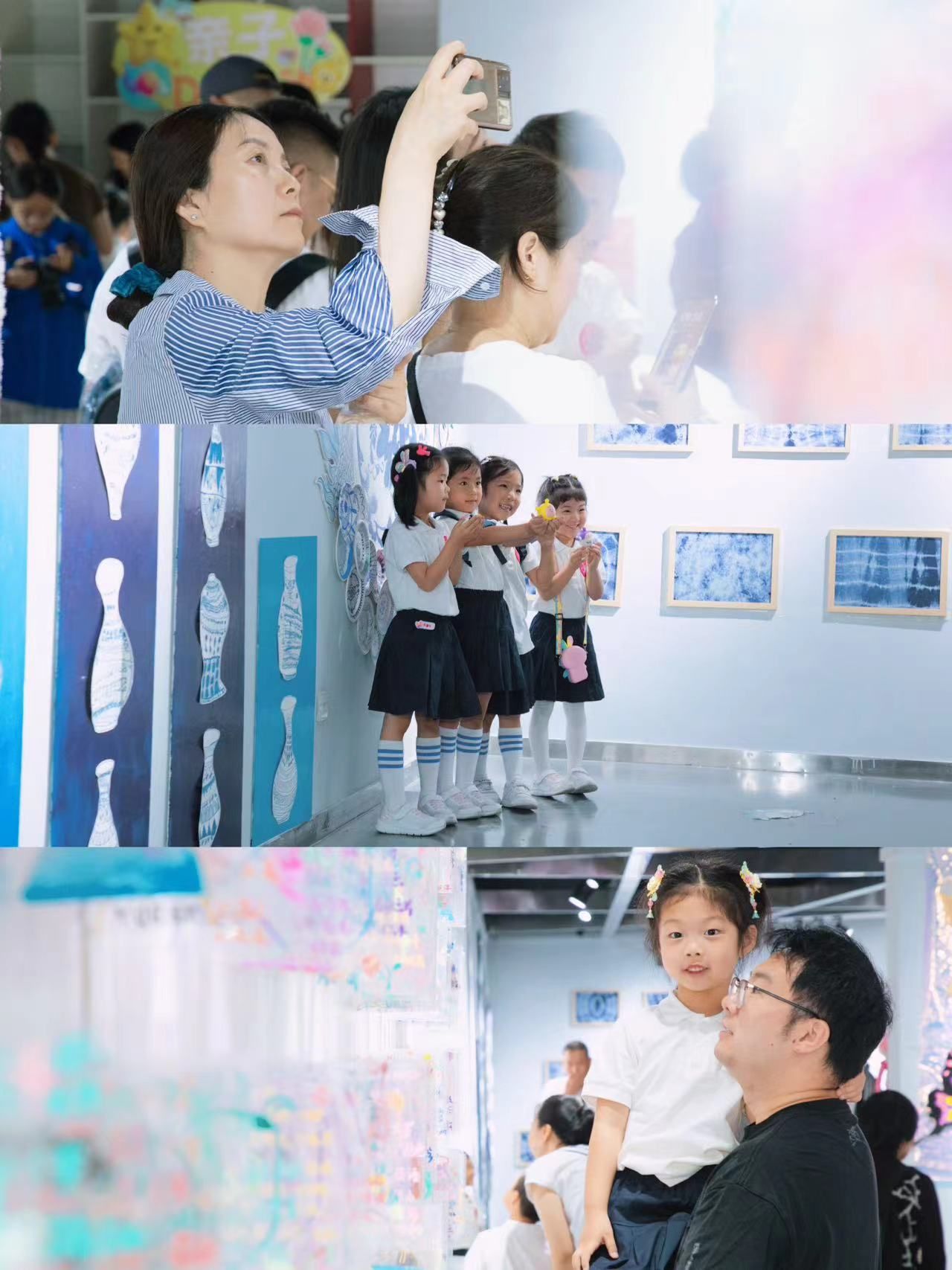 五色经纬织就童年梦想,七彩画笔擘画美好未来。当天,幼儿园在学校大学科技园时尚创意中心艺术交流平台举办了“童心·童画·童世界”—六一儿童画展。画展分为“致敬大师”、“妙笔丹青”、“传承经典”、“环保创新”、“特色延展”“手工DIY”六个主题系列,展出小朋友及亲子绘画、印染、编织、漆染、布艺、纸雕、手工制作等上百幅作品。校领导和相关部门及学院负责人为画展进行了揭幕,并和小朋友及家长一起走进工程大幼儿园小朋友的世界里,用心欣赏他们的作品,用爱聆听他们内心的声音。