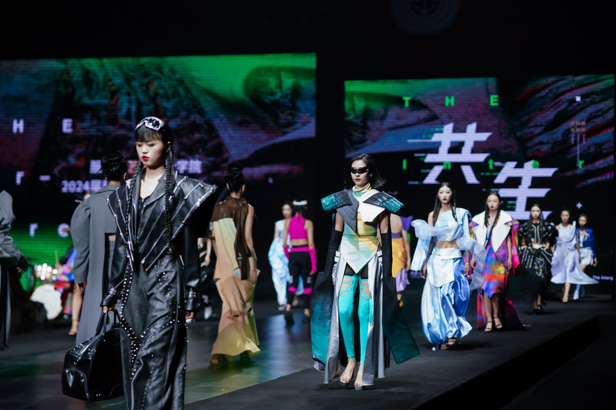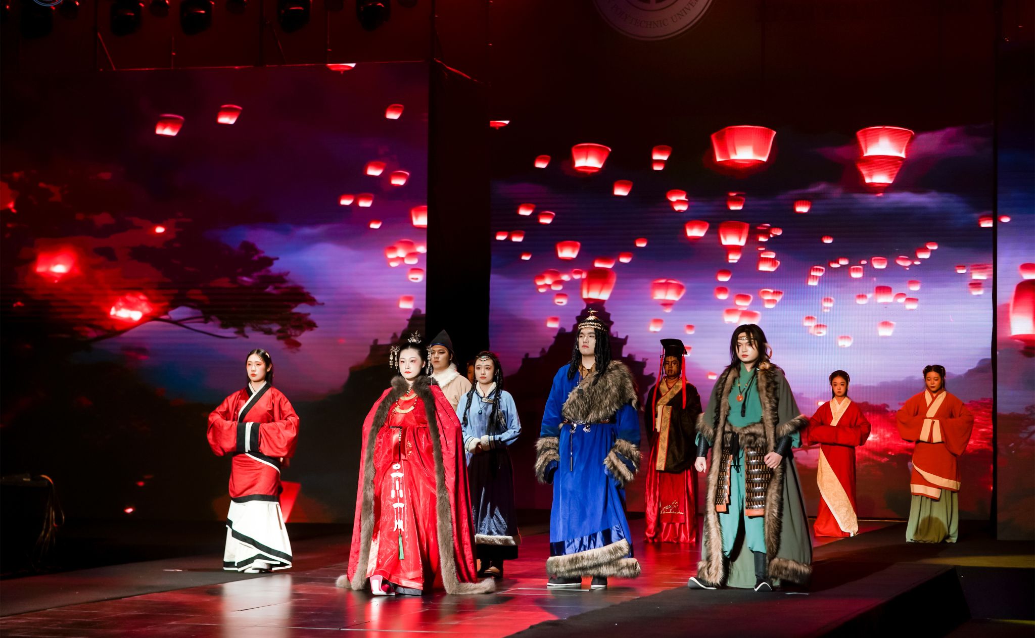 动态展演环节,服装与艺术设计学院带来了主题为《共生》的服装设计展,同学们通过研究中国古典元素,探索了服装设计的全新语境,诠释了传统元素与现代时尚的审美融合,传承弘扬文化经典,引领现代潮流设计,充分展现了当代大学生的文化自信与创新活力。新媒体艺术学院献上《文物有故事》舞台短剧, “家书”“秦王宴饮”“封狼居胥”“昭君出塞”“社尔归唐”“大唐双姝”六个篇章,以6件国宝级文物为开端,演绎文物背后的故事,学子通过现代工艺手法诠释传统服饰之美,还原出秦汉唐三朝的服饰特征和社会风貌。整场内容丰富、形式多样、异彩纷呈,既是对学校人才培养质量的全面检阅,又展现了学生们的才华和创意,彰显出我校在中华优秀传统文化传承以及时尚文化创意设计领域的深厚底蕴和丰硕成果。