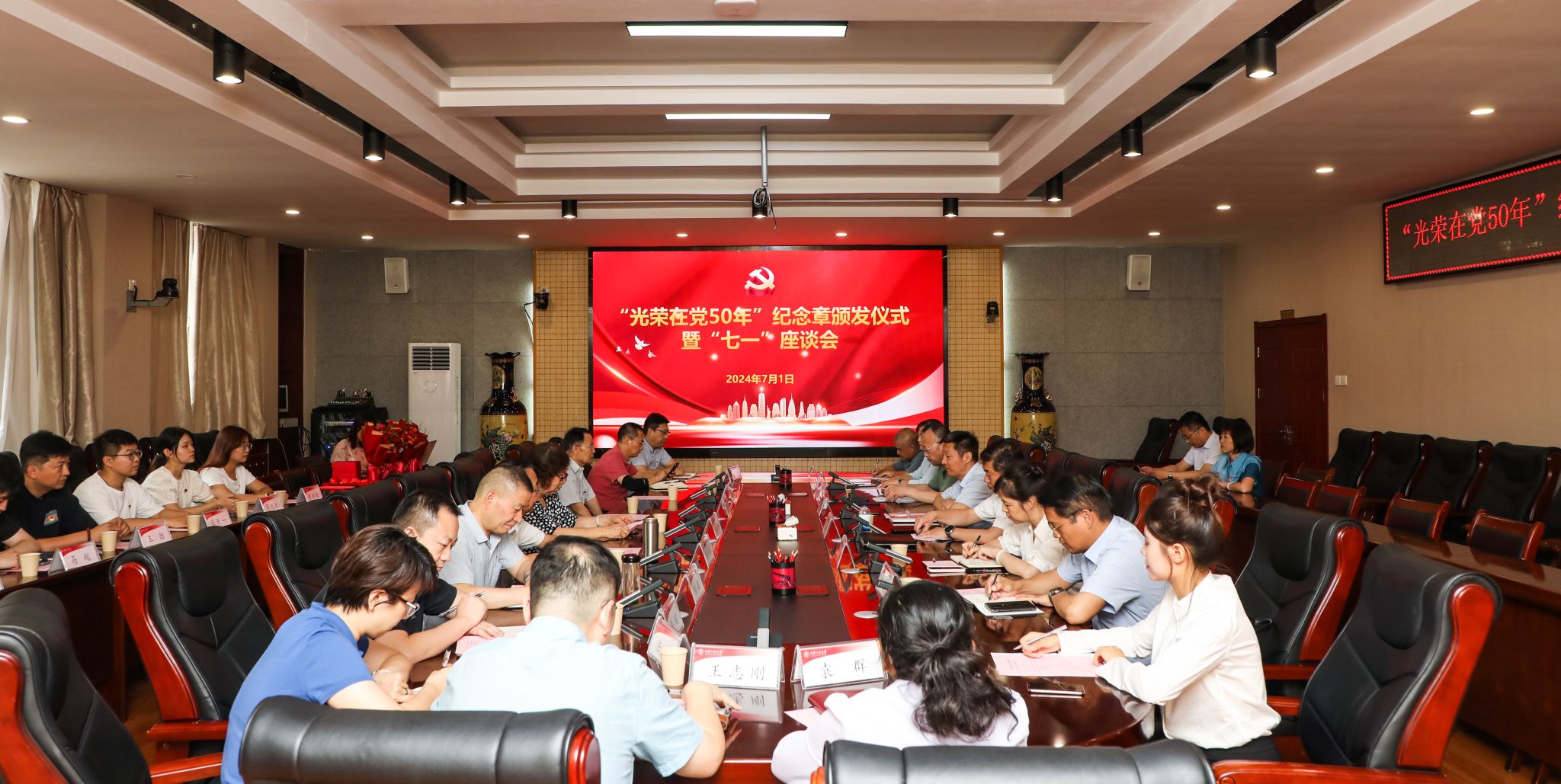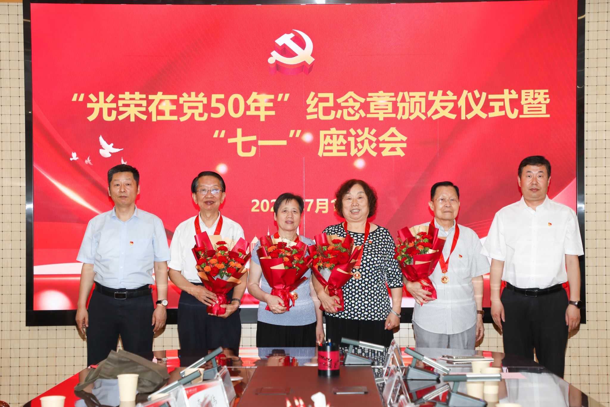 7月1日下午,我校在金花校区第三会议室举办“光荣在党50年”纪念章颁发仪式暨“七一”座谈会。校党委副书记、纪委书记、监察专员辛永昌,党委副书记殷永建出席会议并讲话。会议由校党委委员、组织部部长黄海峙主持,党委相关职能部门负责人、部分院(部)级党组织书记、“光荣在党50年”老党员、师生党员代表参加会议。