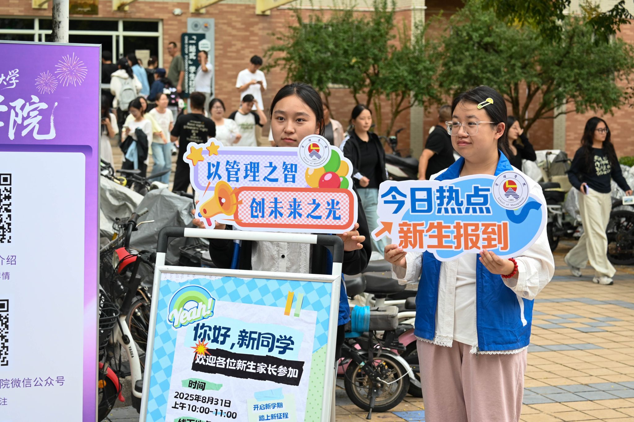 校园内,“你好2025级新同学”“青春正当时,挺膺新征程”“厚德弘毅 博学笃行”……桁架、道旗、展板、横幅与校区特色、校园环境相呼应,营造出浓厚热烈的迎新氛围。为了方便新生报到,学校贴心提供了“一站式”迎新服务,一辆辆摆渡车满载新生和家长驶向临潼校区中心广场,学长学姐高举各学院标牌翘首以盼,形成一条迎新大道,热情引导新生报到;校团委设有5个共青团先锋岗,150余名学生志愿者穿梭在人群之中,为新生及家长提供路线指引、行李搬运等细致服务;学工部、研工部、招就处工作人员耐心解答疑问,财务处、资实处、网信处、后勤管理处、校医院等部门有序做好缴费咨询、帐篷供应、网络运维、工作餐保障、医疗应急等服务,党委保卫部协同交警、保卫队员及时疏导各类车辆有序停放,各单位齐心协力,让每一位新生与家长感受到便捷、高效和温馨的接待服务,展现出了西工程大人昂扬的精神风貌。