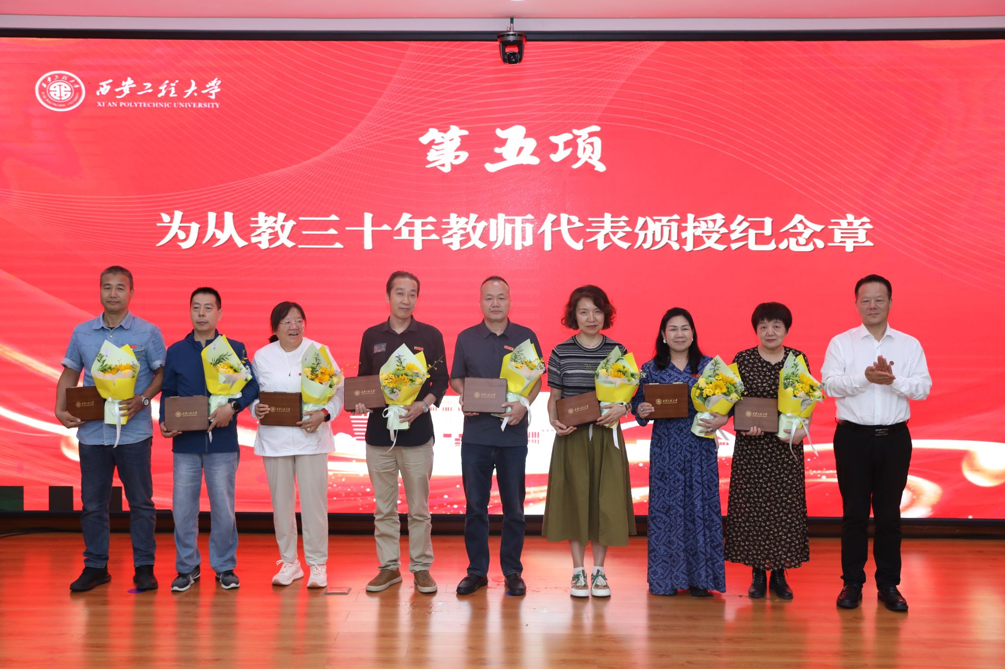 岁月荣光镌刻教育初心,榜样力量点亮育人薪火。张志昌为从教三十年教师代表颁发了荣誉纪念章;校党委副书记井浩宣读表彰文件,校领导分别为教学类、科研类、人才类、思政类获奖代表及2023-2024、2024-2025学年先进集体、先进工作者,师德先进个人、优秀教师等颁奖;学生代表为从教三十年教师代表献花。