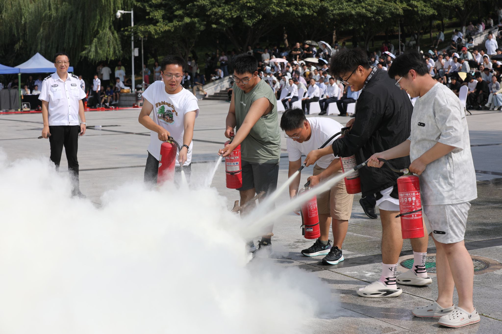 在反恐处突教育中,模拟3名“暴徒”携危险物品闯入校园,学校保卫处迅速启动应急预案,与警方联动快速消除安全隐患;穿越机、无人机灵活穿梭,精准抛投救生圈、打击“嫌疑人”;师生零距离观摩了擒敌拳展示、警犬精准排爆、交通指挥等科目并参加安全问答。在消防安全教育环节,图书馆拉响火情警报,工作人员迅速组织人员疏散和有序撤离;消防队员和医护人员现场展示灭火、逃生、急救等技能,各环节配合紧密,全体参加演练师生平安抵达指定安全区域。在救援技能展示环节,4名专业人员演示心肺复苏方法,36名学生分组进行学习和演示,整场救护演练有序高效,让师生掌握了实用急救技能。