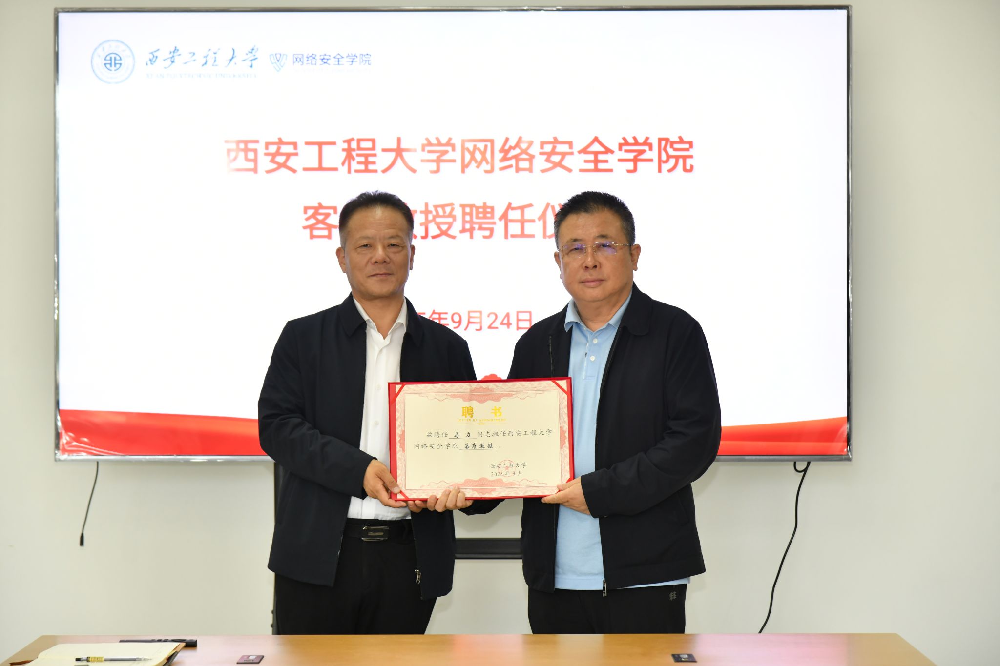 9月24日,我校在临潼校区举行客座教授聘任仪式,校党委书记张志昌为陕西省公安厅刑事侦查局(刑事警察总队)原局长(总队长)马力颁发我校网络安全学院客座教授聘书。