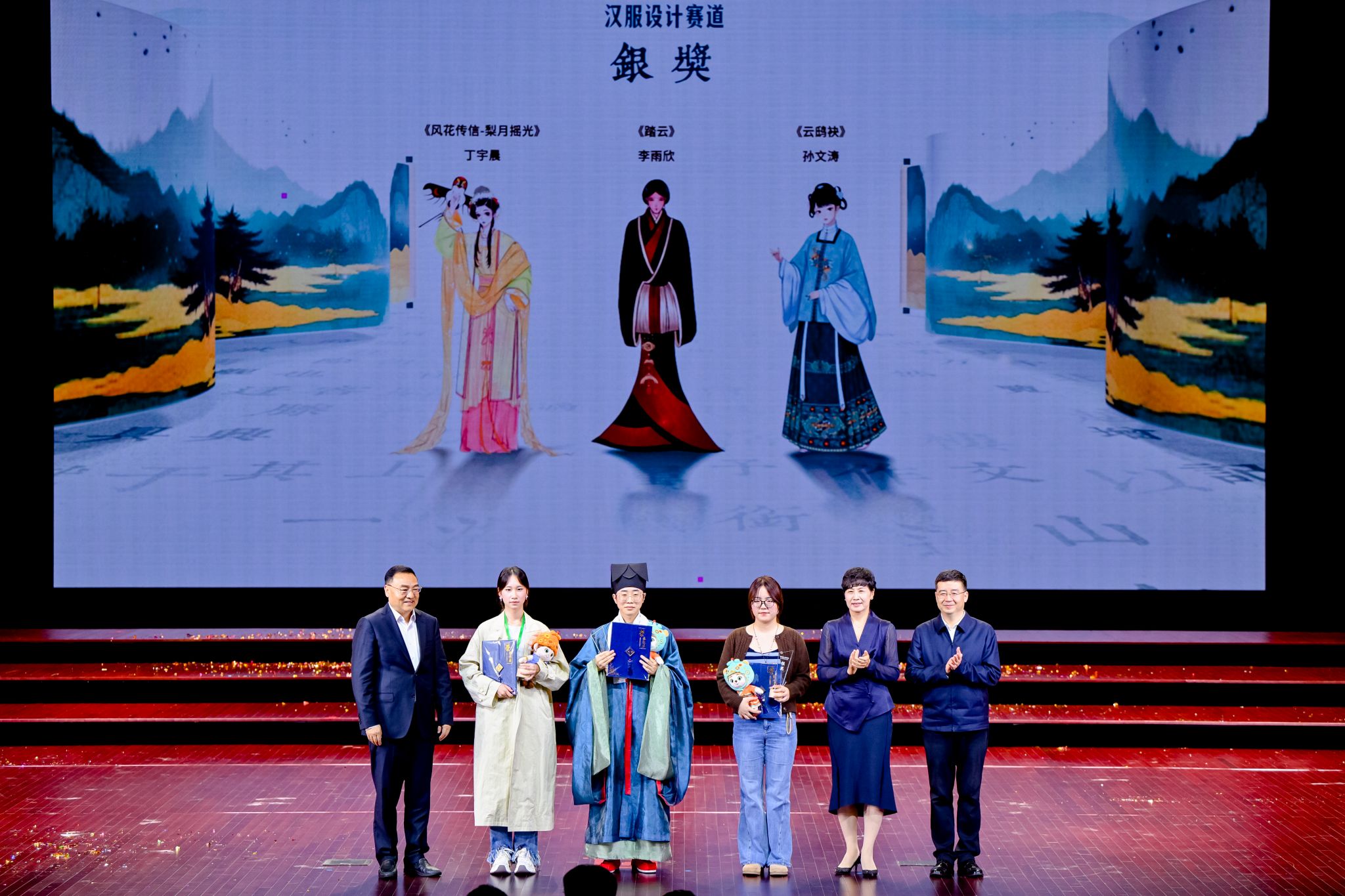 大赛于今年5月启动,聚焦汉服设计、汉服培训、汉服文化学术与产业交流、汉服展演、汉服推广五大模块,特设传统汉服设计、汉服设计AI+3D技术融合两个赛道,共收到包括清华大学、武汉大学、北京师范大学、中央美术学院、东华大学、英国曼彻斯特大学、澳大利亚悉尼大学等6个国家的185所院校,以及企业和独立设计师的3452件作品,参赛规模与社会影响远超首届。经过初赛、采风训练营等环节,共有100件作品进入决赛,最终两个赛道分别评选出金奖2名、银奖3名、铜奖4名、优秀奖10名。在传统汉服设计赛道中,清华大学曾令栀的作品《振朱羽兮越莽苍》、我校姬镜涵的作品《镜光鎏影》获得金奖;我校丁宇晨的作品《风花传信-梨月摇光》、广东培正学院李雨欣的作品《踏云》、河南科技大学孙文涛的作品《云鸱袂》获得银奖;我校陈欣毓的作品《唐宫影》、李明轩的作品《金缕玄甲》,浙江理工大学李奕雅的作品《九歌·东君》、郑奕琳的作品《残荷》获得铜奖。在汉服设计AI+3D技术融合赛道中,天津师范大学邱文年的作品《紫绮赋》、北京服装学院艾于冬的作品《初唐渝彩》获得金奖,扬州大学常嘉星的作品《敦煌梦霓裳》、山东工艺美术学院高云珂的作品《沉吟观复》、安徽工程大学李玥潼的作品《豆蔻云裳:AI+3D重现唐代官家少女的锦瑟年华》获得银奖,我校钱琪悦的作品《云锦》、内蒙古工业大学马仲祥的作品《紫极承辉》、江南大学胡绮文的作品《宋仁宗后坐像》、大连工业大学杨钰的作品《溯裳》获得铜奖。徐明非、谢泱、张志昌等领导为获得金奖的选手颁奖。