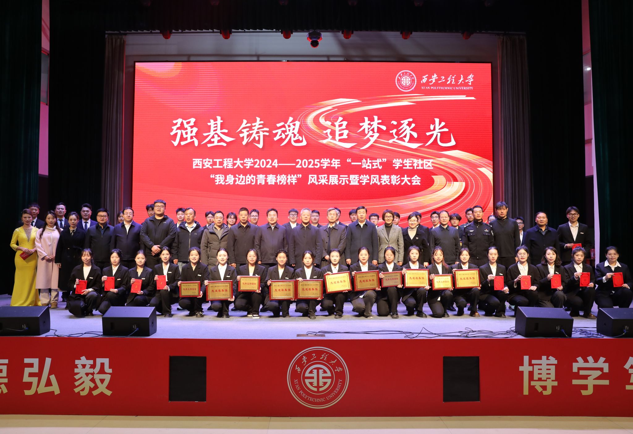 12月3日,我校在临潼校区举办2024-2025学年“一站式”学生社区“我身边的青春榜样”风采展示暨学风表彰大会。校领导张志昌、井浩、殷永建、张美忠、朱永民、夏蔡娟、张洛红出席大会,设奖企业代表、属地公安干警代表、各学院负责人以及辅导员代表、学生代表共计600余人参加大会。