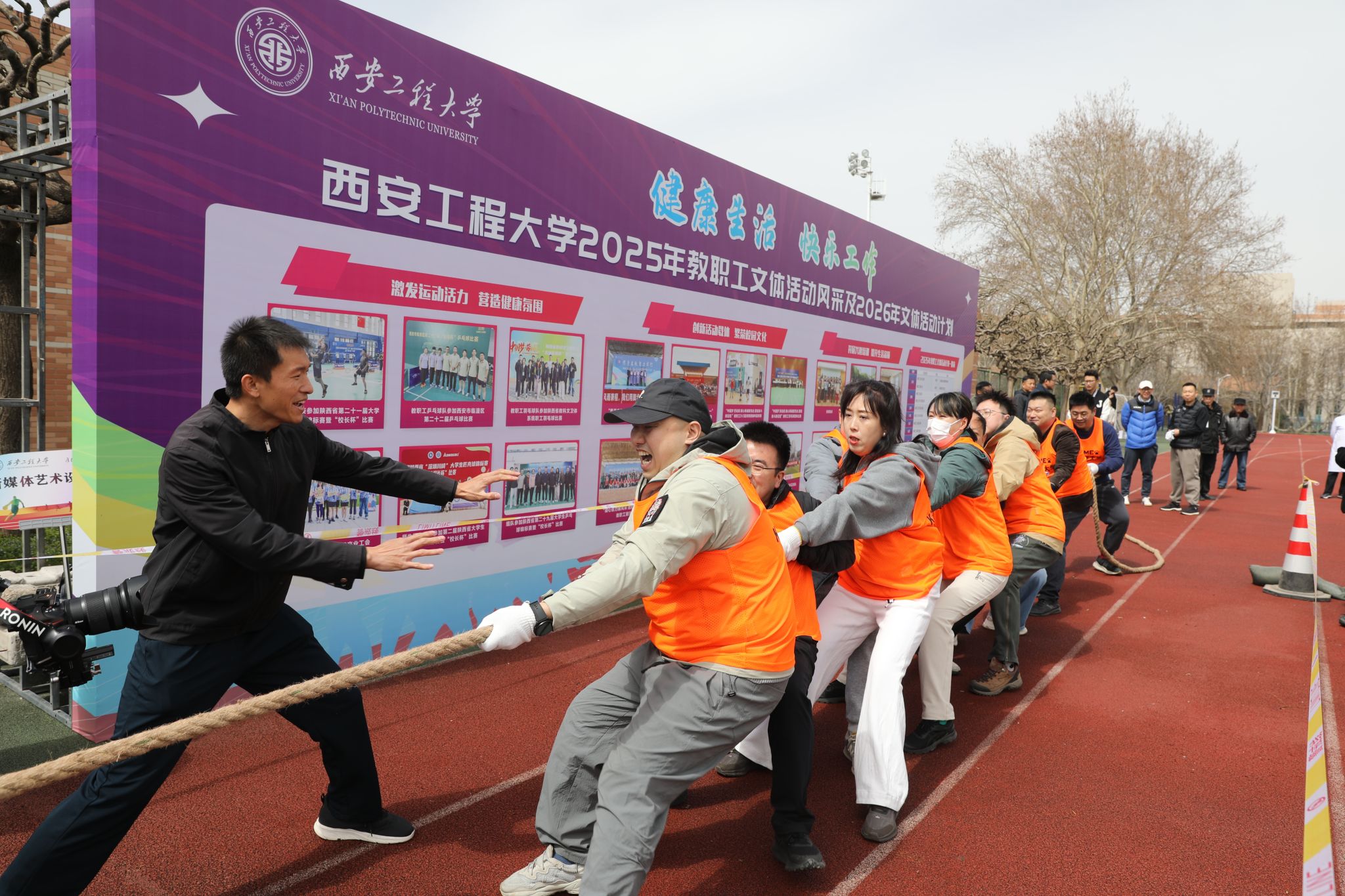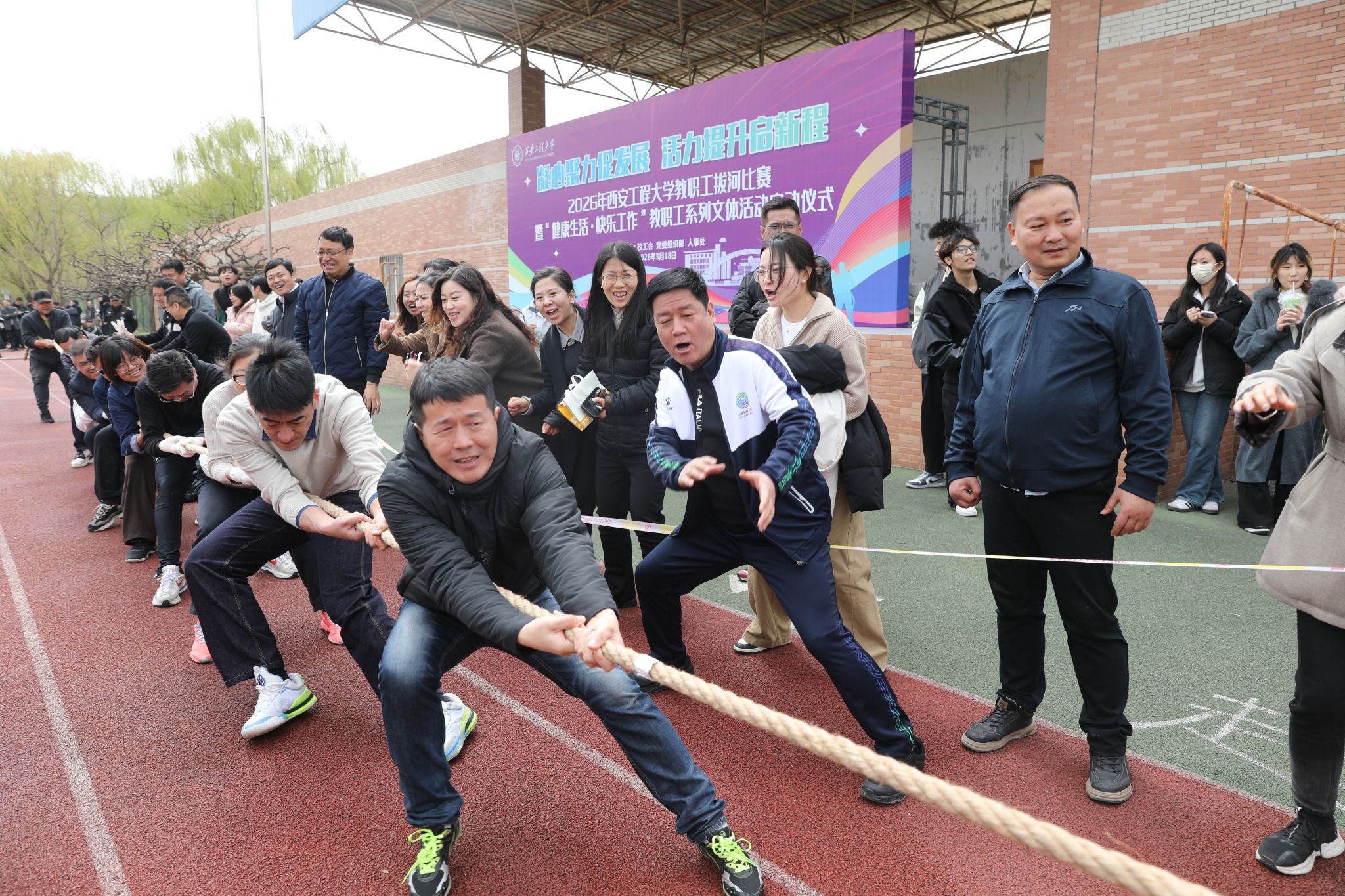 3月18日,由校工会、党委组织部、人事处联合主办的2026年教职工拔河比赛暨“健康生活,快乐工作”教职工系列文体活动启动仪式在临潼校区骊霞体育场举行。校领导张志昌、殷永建、戴鸿、夏蔡娟、杨建、张洛红出席活动。各职能处室、学院党政负责人、各分工会主席及19支队伍、近300名教职工参加了比赛。