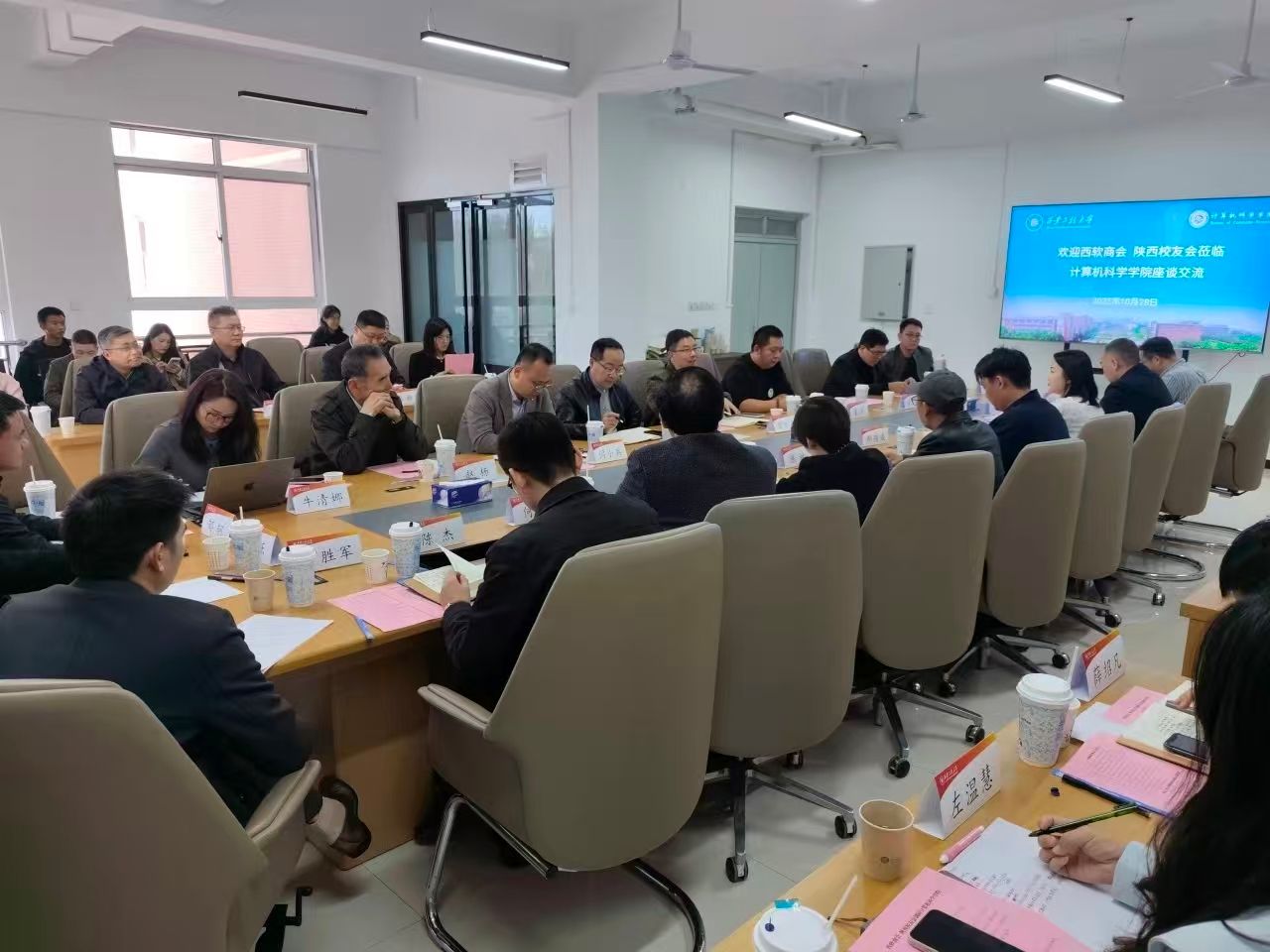 10月28日,西安高新区软件和信息服务业商会会长陈林及商会15家信息类会员企业负责人、我校陕西校友会一行赴计算机科学学院,围绕院企合作、人才培养方案优化、科研成果转化、就业岗位需求等议题开展座谈交流。招生就业工作处处长付刚,计算机科学学院党政班子、各科研团队负责人和骨干、学工办主任、就业辅导员参加会议,会议由学院党委副书记闫小兵主持。