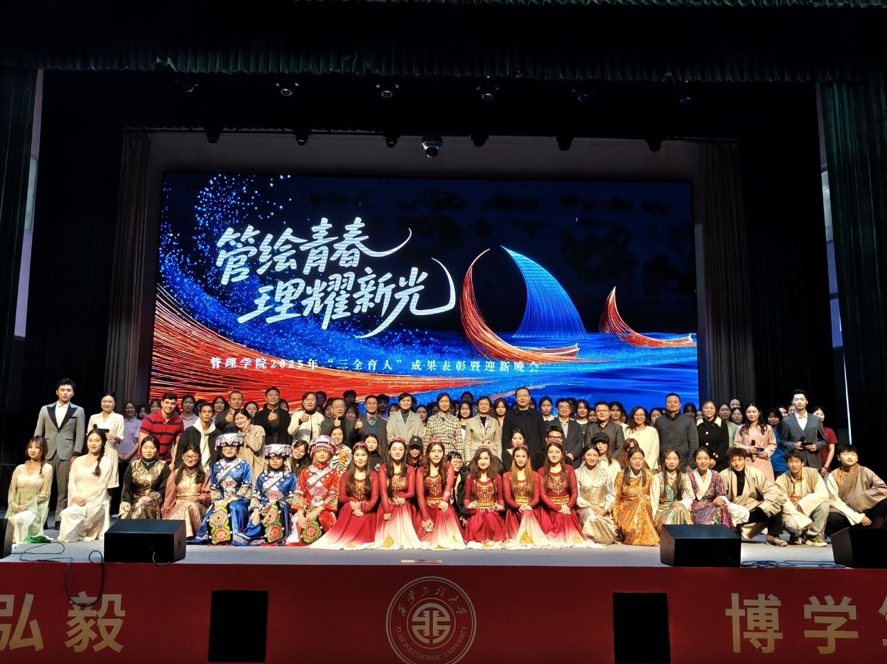 11月20日,管理学院在临潼校区大学生活动中心举办2025年“三全育人”成果表彰大会暨“管绘青春 理耀新光”迎新晚会。学校相关部门负责人,学院校友代表、党政班子成员、“三全育人”导师团代表、全体辅导员以及学校留学生代表与2025级本硕新生600余人参加活动。
