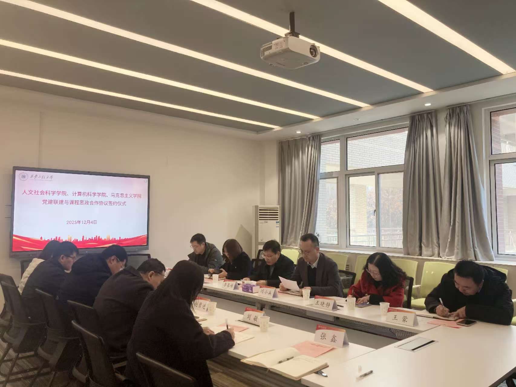 12月4日,人文社会科学学院、计算机科学学院和马克思主义学院举行《党建联建与课程思政合作框架协议》签署仪式,正式启动三个学院的党建联建和课程思政合作。人文社会科学学院党委书记李喜峰、计算机科学学院党委副书记闫小兵、马克思主义学院党委副书记傅博娜出席会议并签订协议,三个学院的党委副书记、教学副院长和部分教师代表参加会议,会议由闫小兵主持。