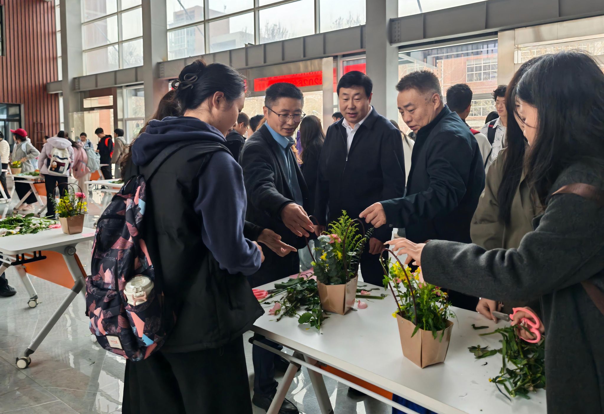 3月25日,我校2026年心理育人宣传季实践活动启动仪式暨第二届花艺团体心理育人活动在临潼校区笃行楼一楼大厅举行。校党委副书记殷永建深入现场参加活动交流。本次活动由党委学生工作部主办,城市规划与市政工程学院承办,旨在通过花艺体验与心理育人相结合的方式,引导学生关注心理健康,培育积极心态。全校百余名师生共同参与了活动。