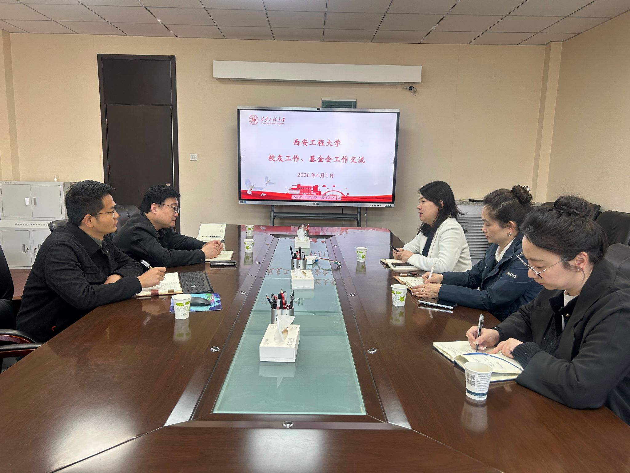 4月1日,西安理工大学国内合作与校友处处长郝敏敏一行三人来校调研交流,我校国内合作与校友工作处处长郭可义及部门相关人员在临潼校区座谈交流。